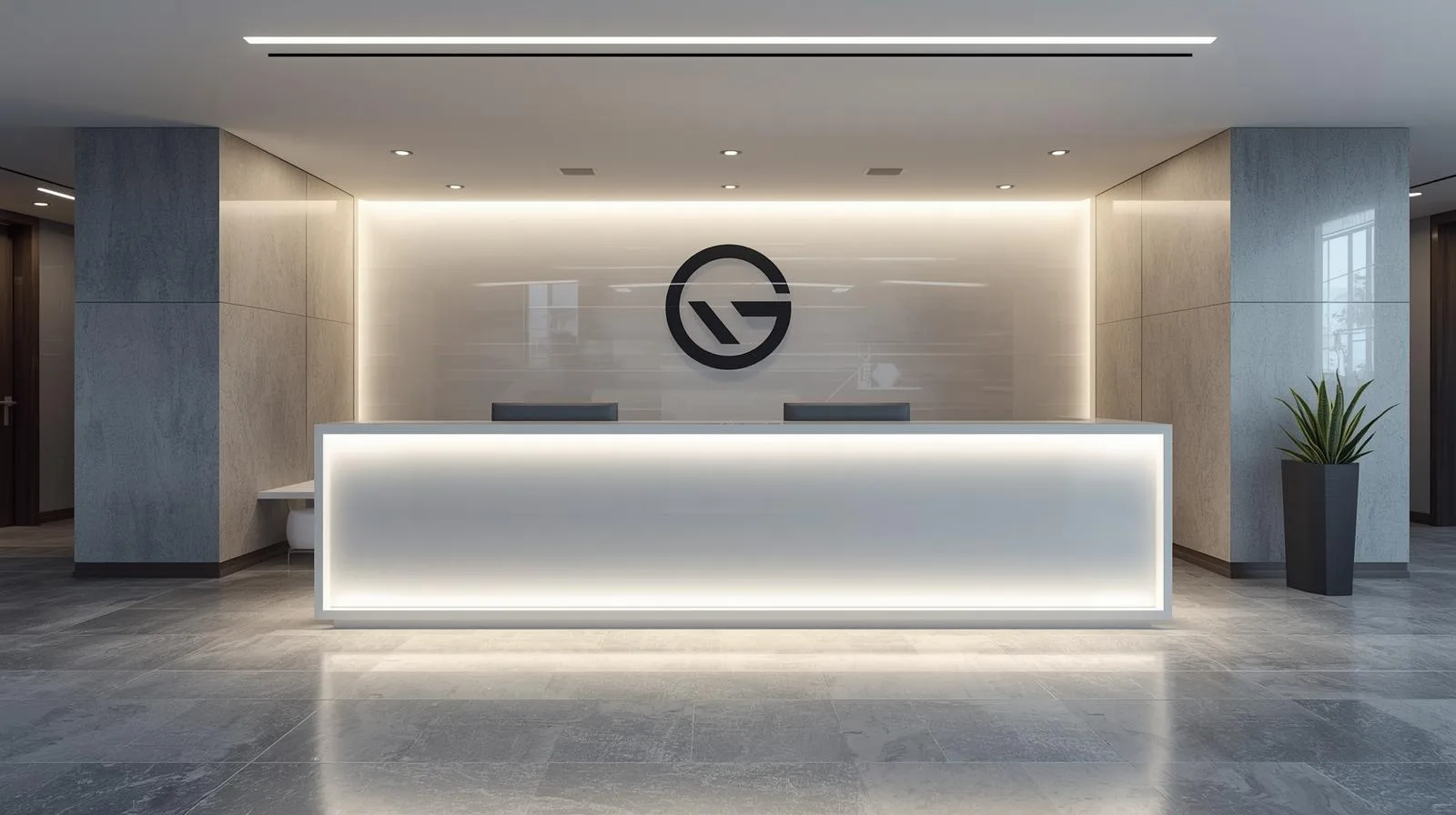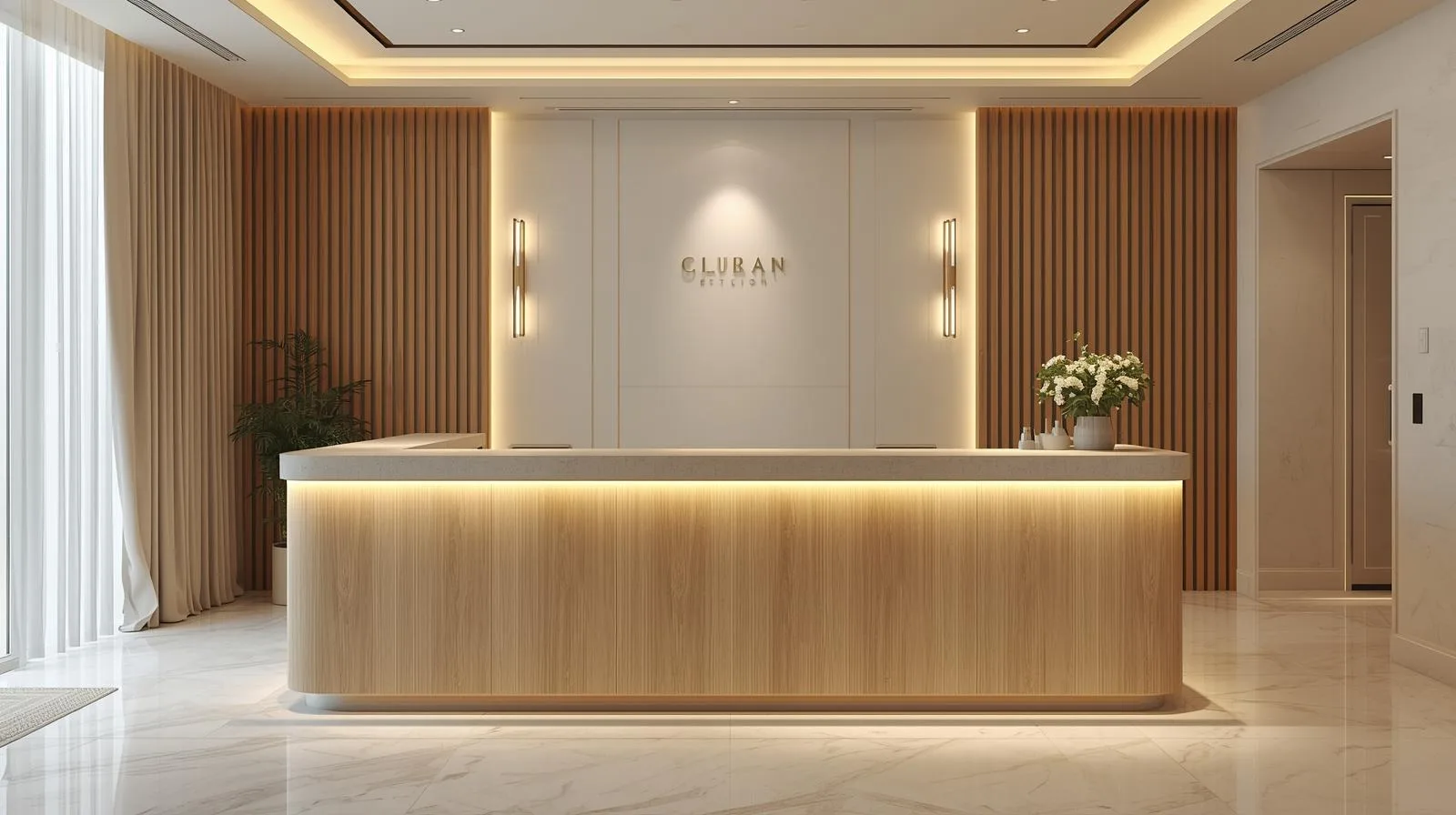 Một mẫu quầy lễ tân chữ L hiện đại tone trắng hoặc be sáng, kết hợp ánh sáng hắt nhẹ và logo kim loại mạ vàng, sẽ giúp không gian trở nên sang trọng và thư giãn.