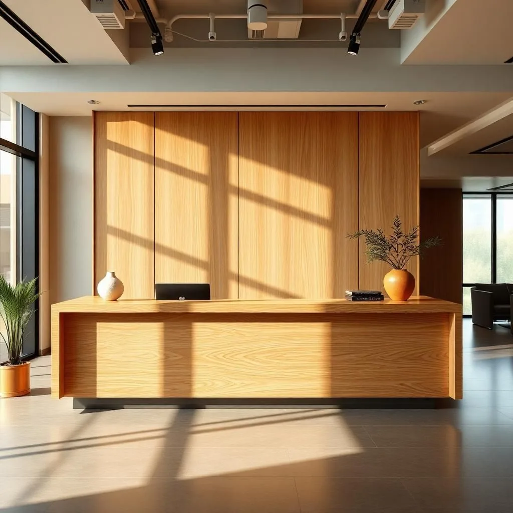 | Văn phòng công ty | Quầy MDF phủ Laminate hoặc Acrylic, kiểu dáng chữ L hoặc cong mềm mại. |