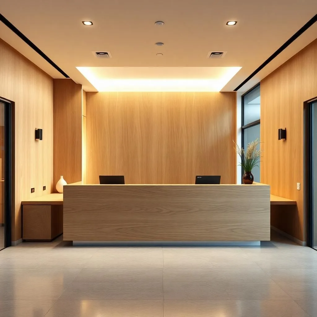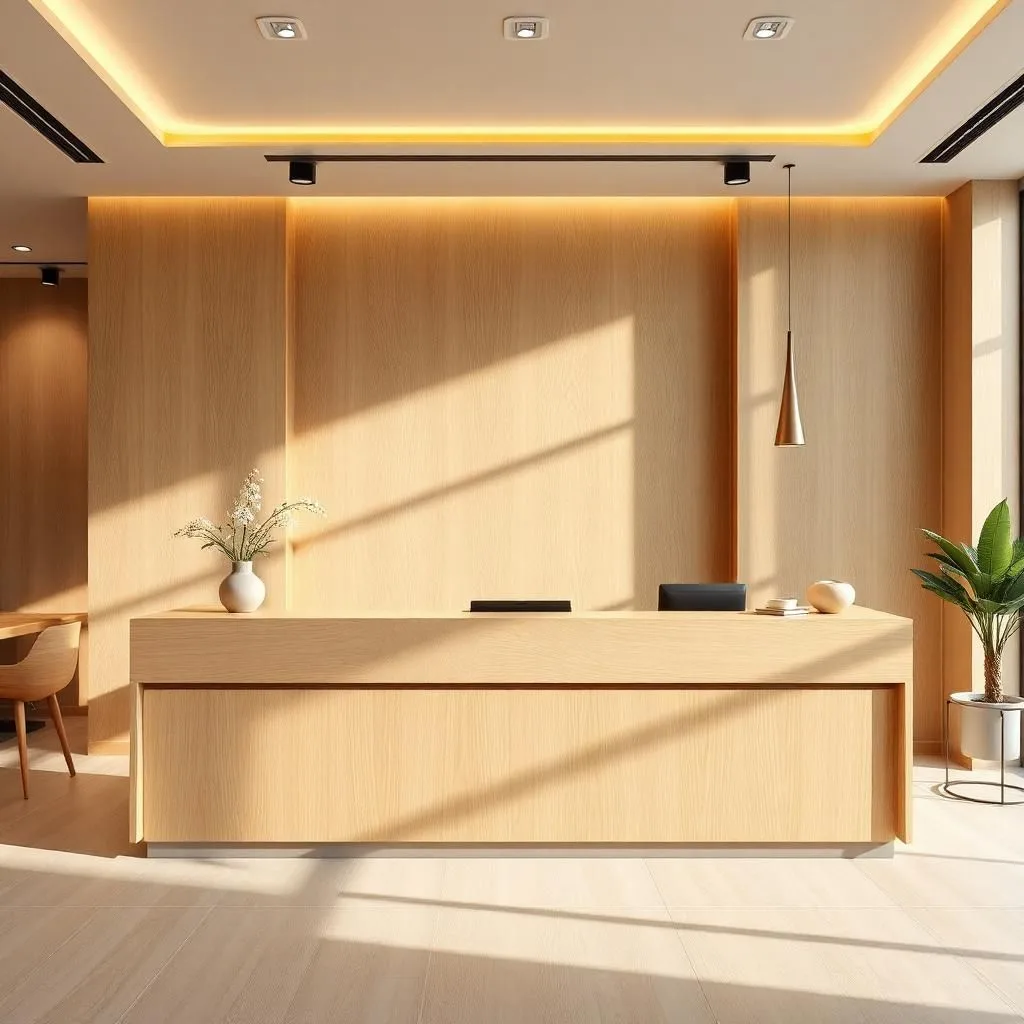 Kết hợp MDF CNC hoa văn, logo thương hiệu hoặc đèn LED ẩn để tạo điểm nhấn độc đáo cho quầy lễ tân.