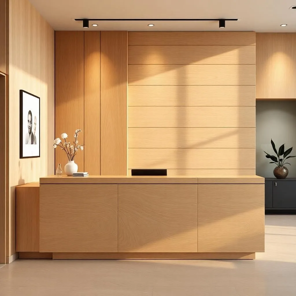 Kết hợp MDF phủ Acrylic bóng gương hoặc Laminate vân đá – mang lại cảm giác đẳng cấp cho khu vực tiếp khách.