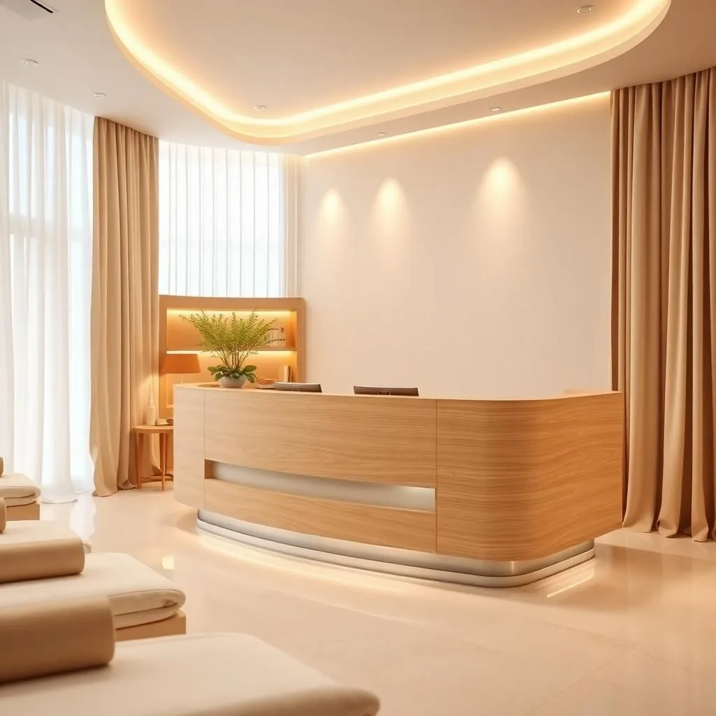 Dành cho các spa và văn phòng hiện đại, quầy MDF tone trắng hoặc be, đường nét gọn gàng giúp tạo cảm giác sạch sẽ, chuyên nghiệp.