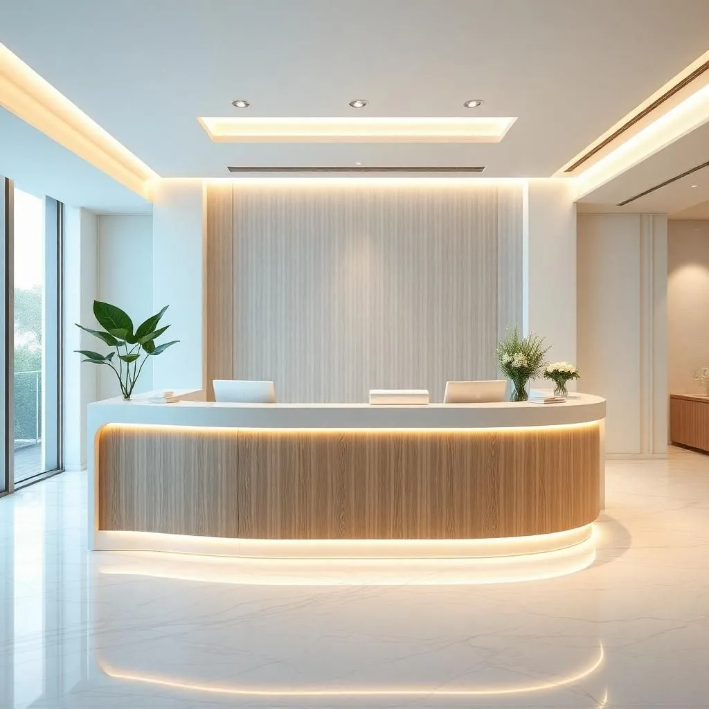 Sử dụng chi tiết phào chỉ nhẹ nhàng, màu kem hoặc trắng sữa, quầy mang nét mềm mại, thanh lịch – lý tưởng cho spa cao cấp hoặc resort.