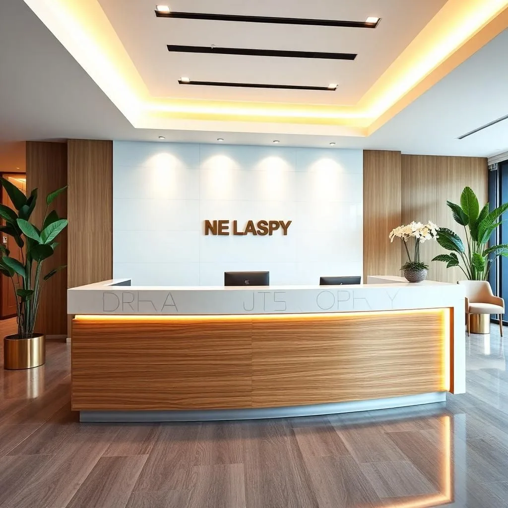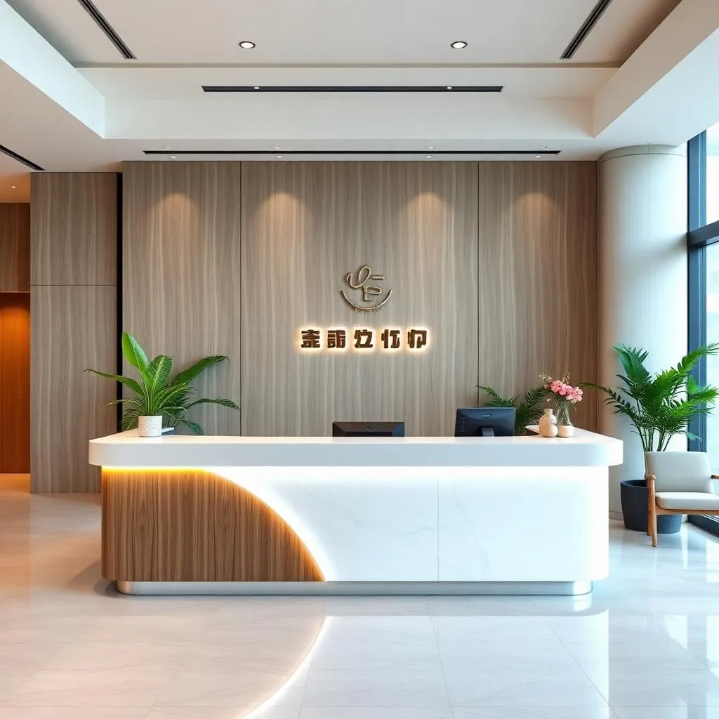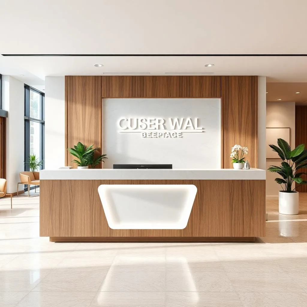 Quầy lễ tân kết hợp logo nổi: Tạo điểm nhận diện thương hiệu mạnh mẽ, chuyên nghiệp.