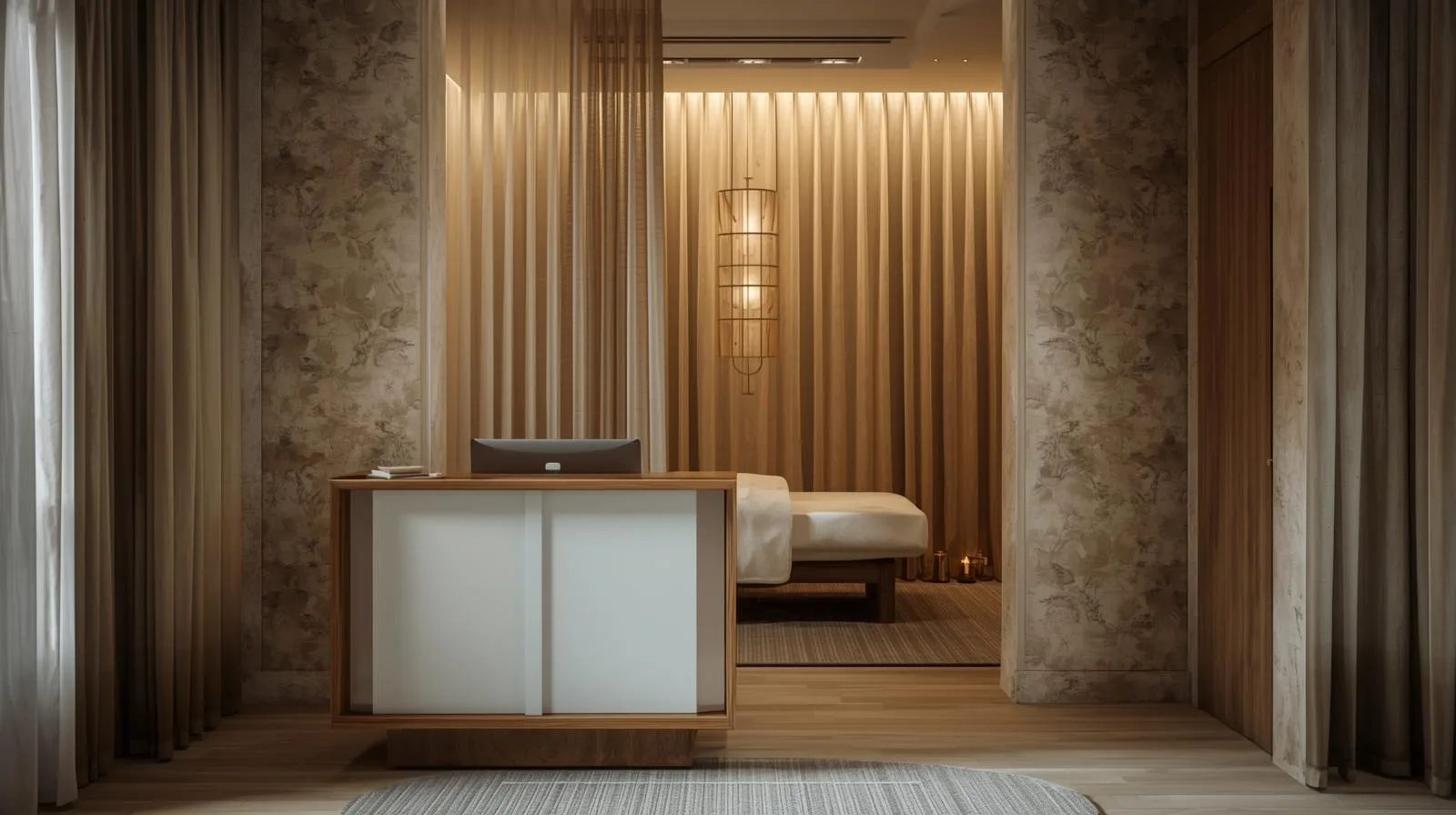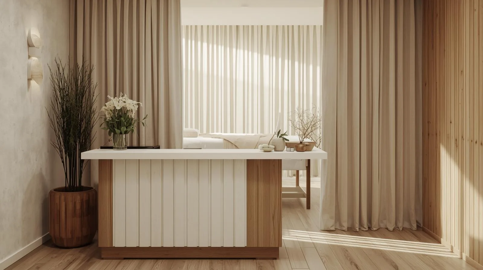 Phong thủy là yếu tố được nhiều doanh nghiệp và chủ spa quan tâm khi bố trí quầy lễ tân. Tone trắng nâu tự nhiên không chỉ mang tính thẩm mỹ mà còn có ý nghĩa phong thủy tốt.