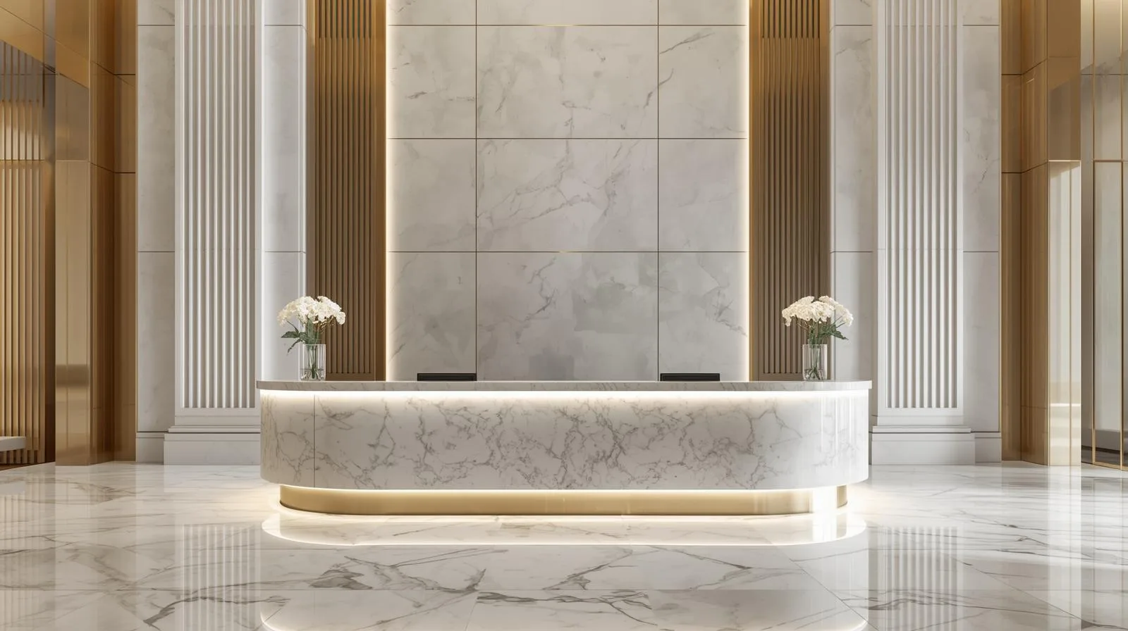 Tại Bluecons, chúng tôi chuyên thiết kế và thi công quầy lễ tân tone trắng theo yêu cầu, đảm bảo từng đường nét đều tinh xảo và phù hợp phong cách thương hiệu. Các mẫu quầy được gia công từ gỗ MDF chống ẩm, acrylic bóng gương, đá solid surface hoặc kính cường lực, kết hợp ánh sáng LED ẩn, viền inox mạ vàng… tạo nên tổng thể sang trọng, bền bỉ và cuốn hút.
