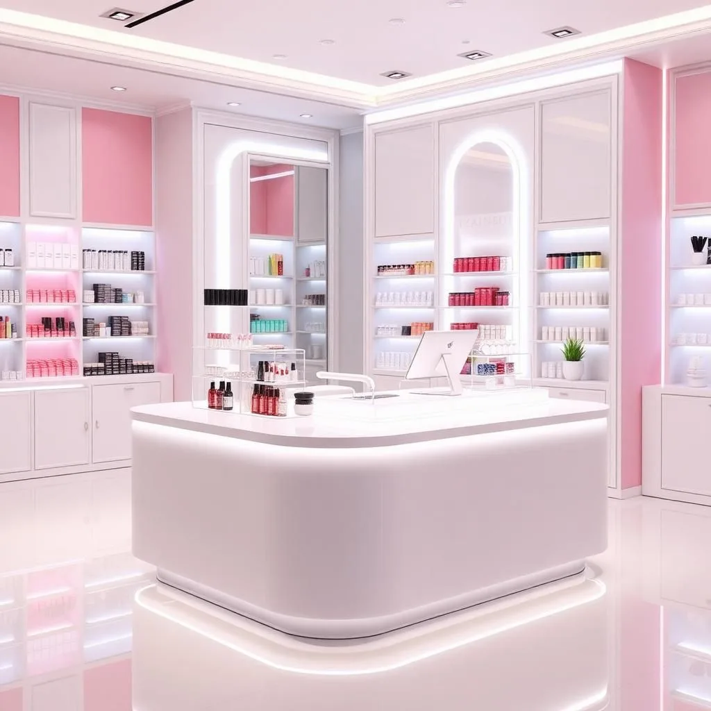 Các vật liệu như Inox mạ PVD, đá nhân tạo, kính cường lực giúp tạo phong cách hiện đại, dễ vệ sinh, phù hợp cho các cửa hàng mỹ phẩm hoặc siêu thị.