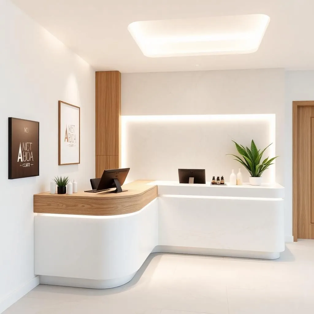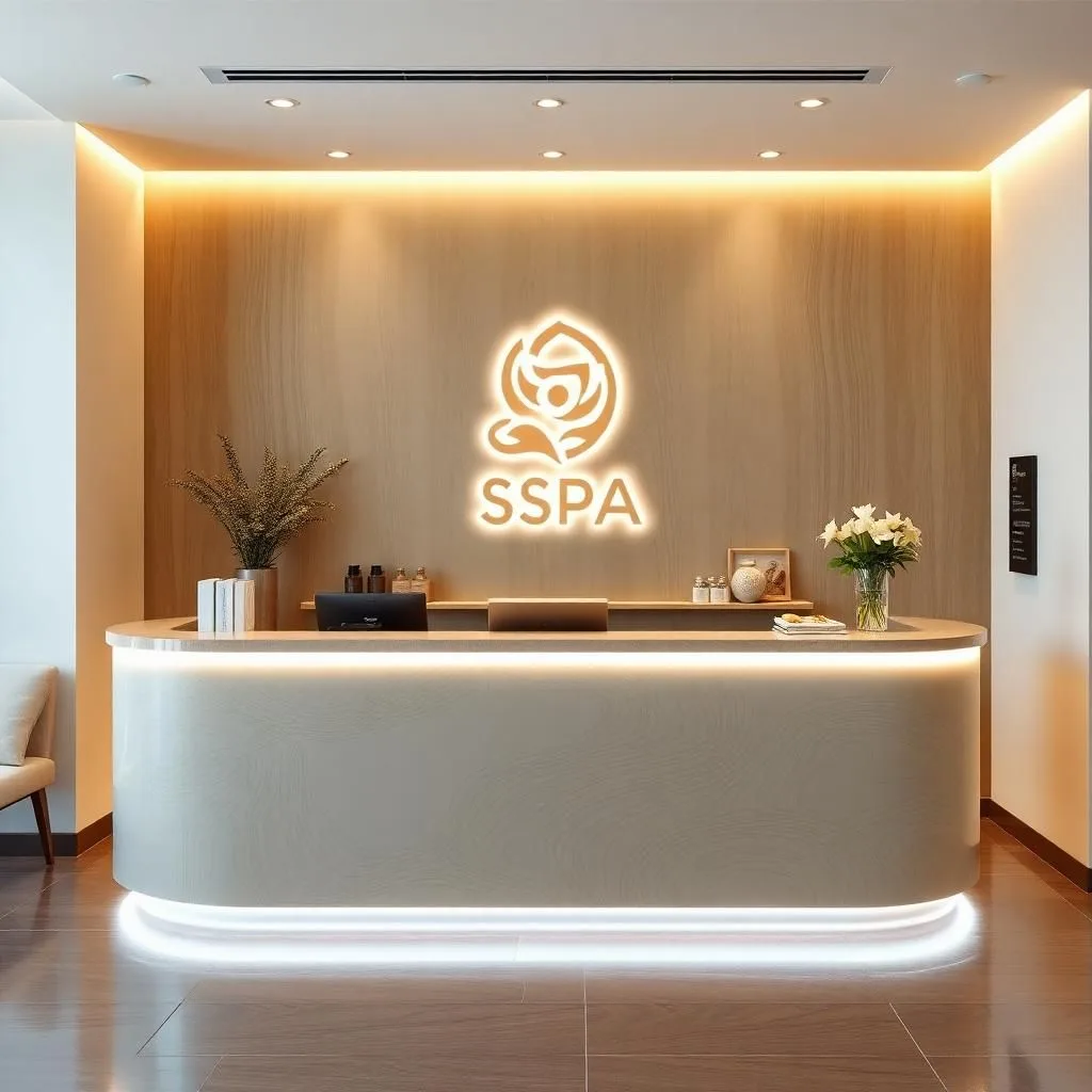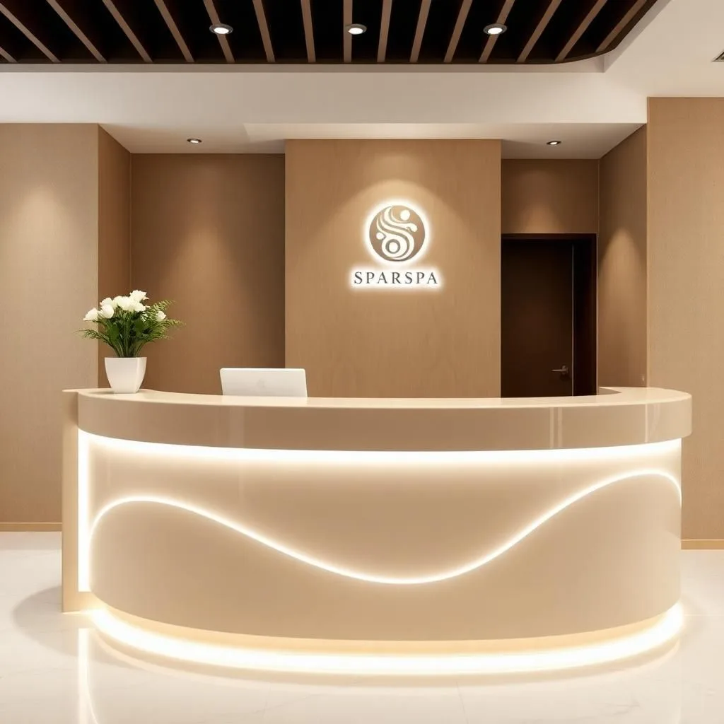 Logo thương hiệu: Đặt vị trí trung tâm quầy, vừa tầm mắt để khách hàng dễ ghi nhớ hình ảnh spa.