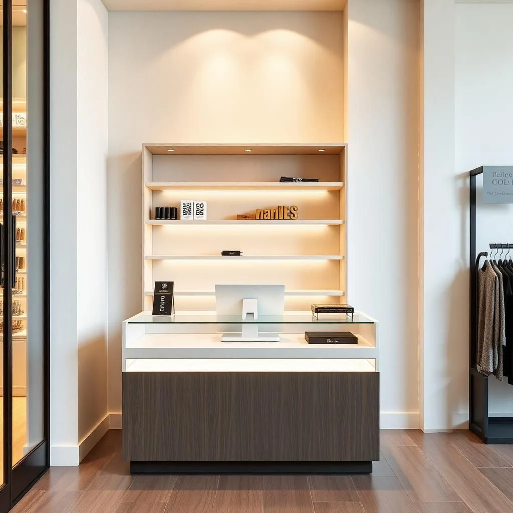 Ưu tiên phong cách hiện đại, màu trắng hoặc gỗ sáng, kết hợp logo thương hiệu và ánh sáng LED nhẹ.