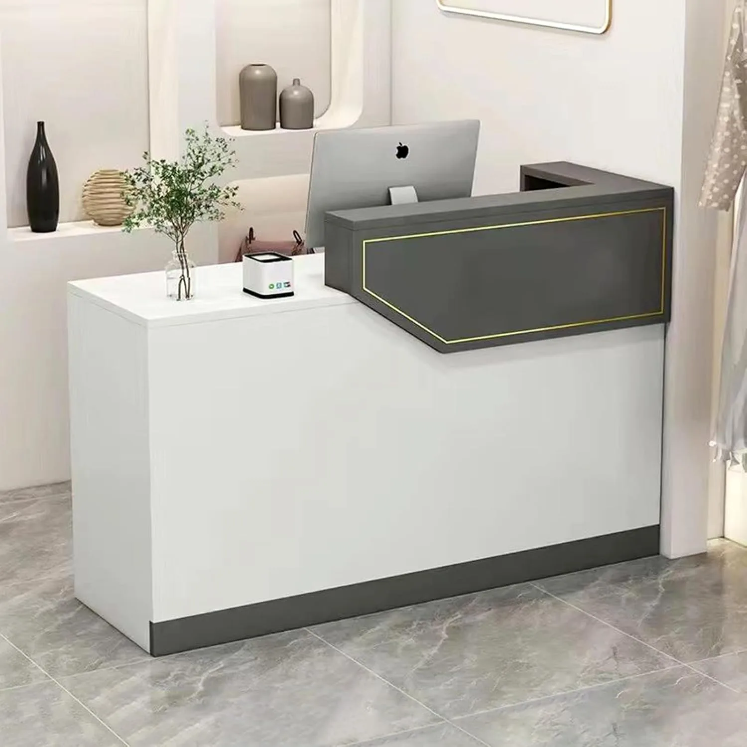 Thiết kế vuông vắn, màu trắng đen hoặc vân gỗ kết hợp kim loại tạo nên sự đơn giản, thanh lịch. Mẫu quầy này phù hợp với các quán cafe take-away, spa mini hay văn phòng giao dịch.