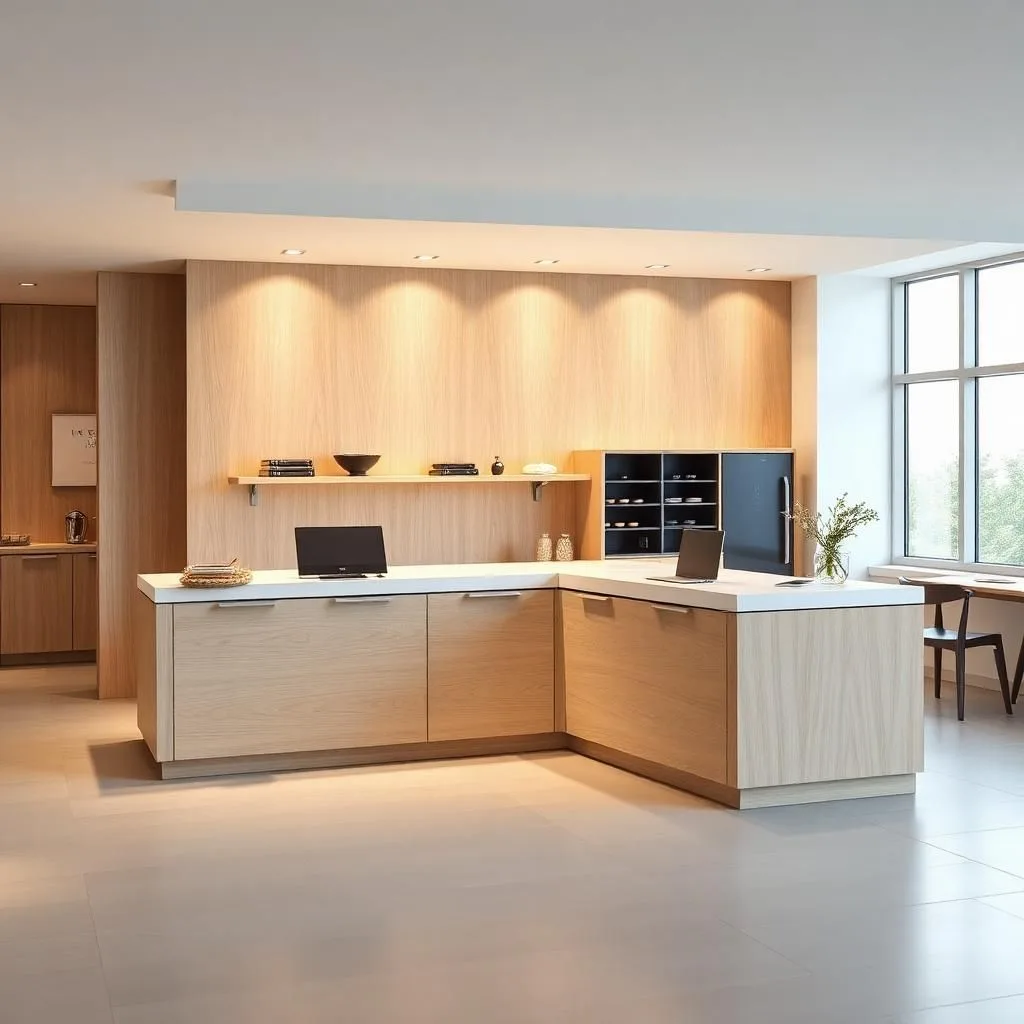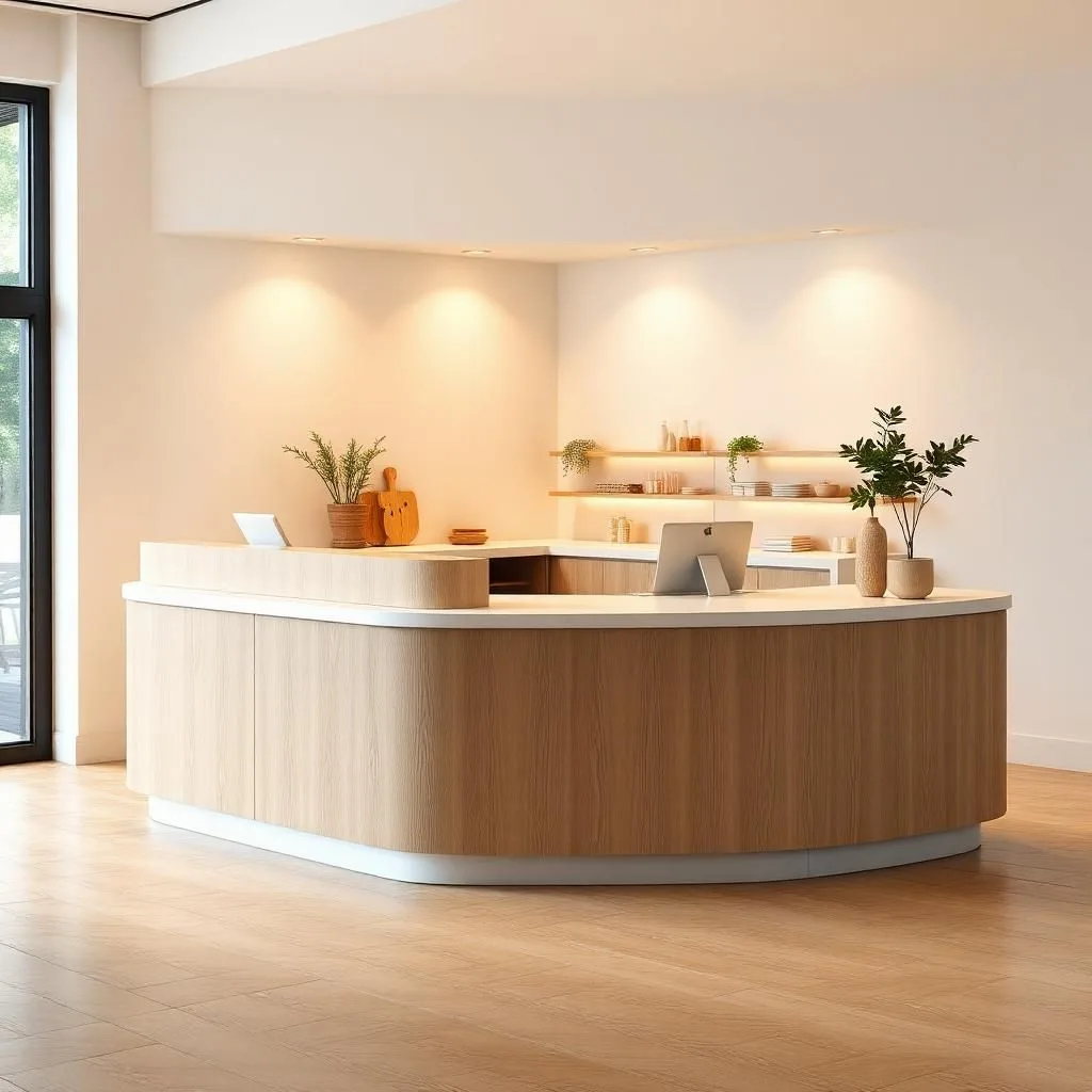 Điểm nổi bật của quầy thu ngân Bắc Âu nằm ở sự kết hợp hài hòa giữa gỗ tự nhiên và ánh sáng. Mặt quầy thường làm từ gỗ công nghiệp MDF phủ veneer hoặc Melamine vân gỗ sáng, kết hợp chân sắt sơn tĩnh điện hoặc các chi tiết trắng tinh khôi, tạo nên vẻ đẹp thanh thoát và sang trọng. Không cầu kỳ trong chi tiết, mọi đường bo góc, ngăn kéo hay tay nắm đều được thiết kế tinh gọn nhưng tiện dụng, thể hiện sự tinh tế đặc trưng của phong cách Bắc Âu.
