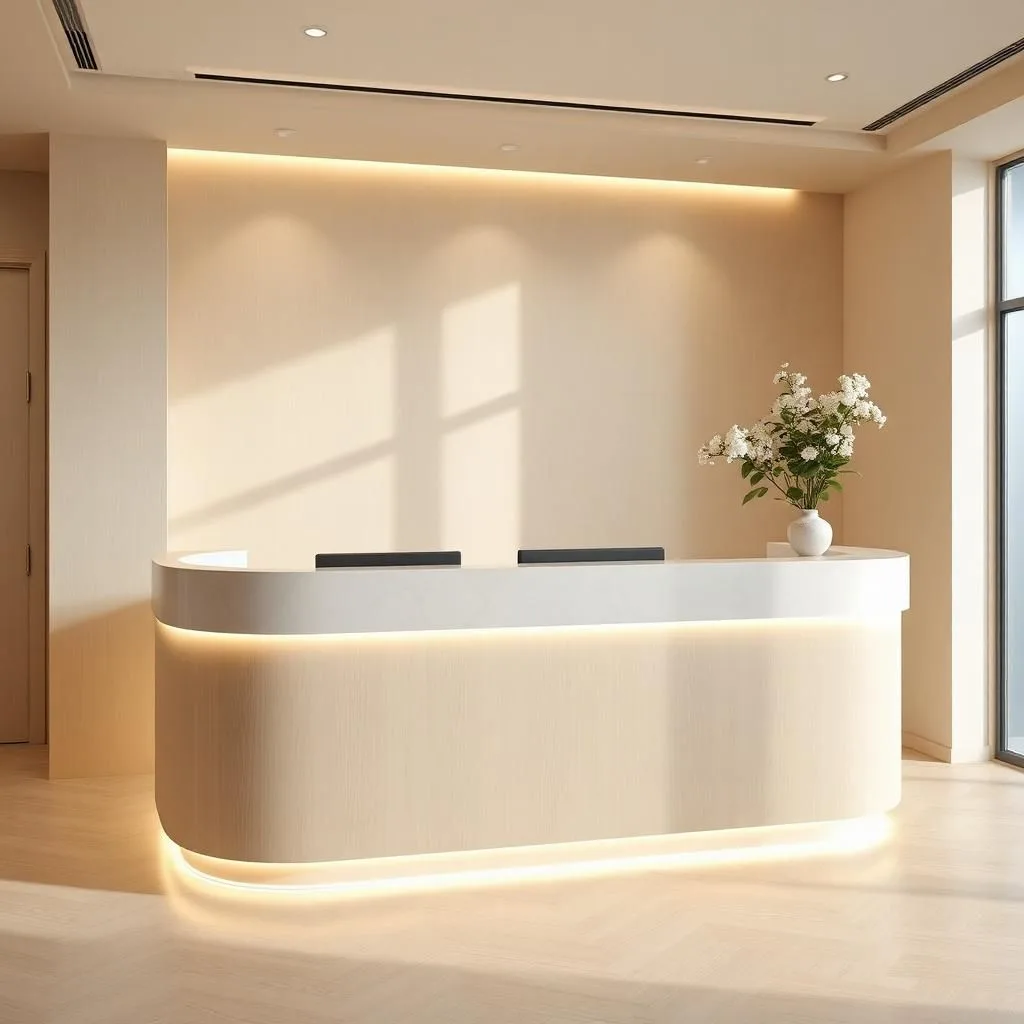 Bluecons gợi ý kết hợp quầy thu ngân tone trắng – be với logo spa nổi bật, kèm đèn viền ẩn giúp tổng thể mềm mại và cao cấp.