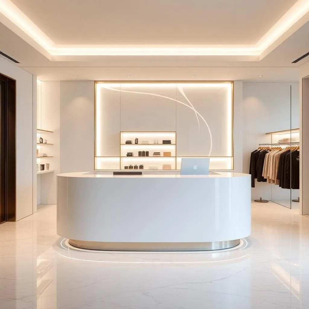 Một quầy thu ngân trắng kết hợp viền vàng hoặc ánh kim sẽ làm nổi bật phong cách thời thượng, phù hợp với các thương hiệu thời trang cao cấp.