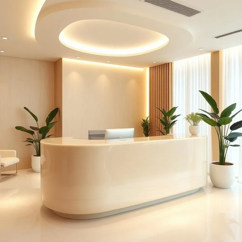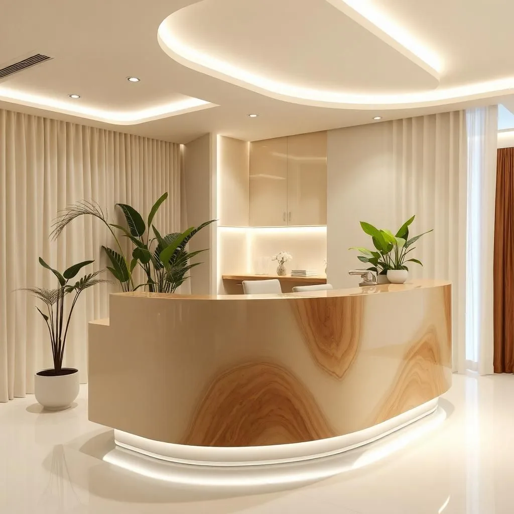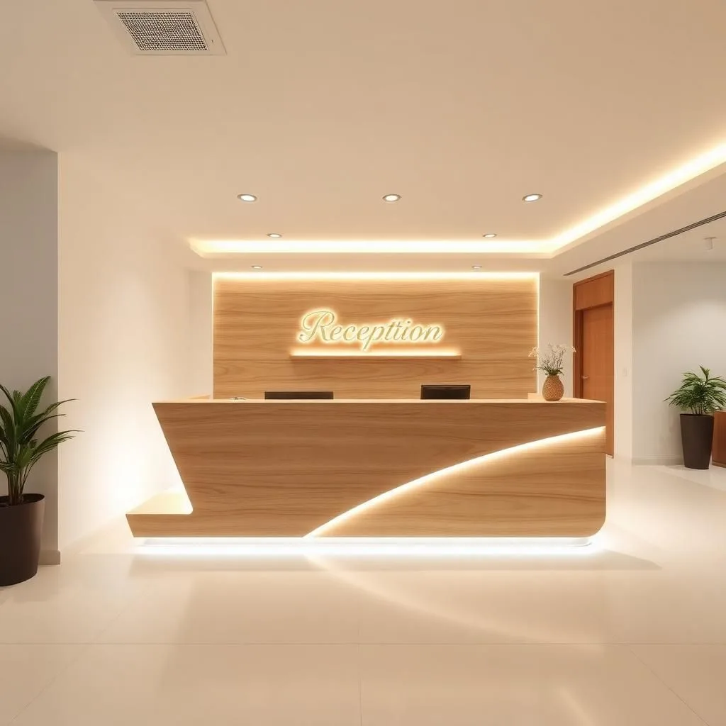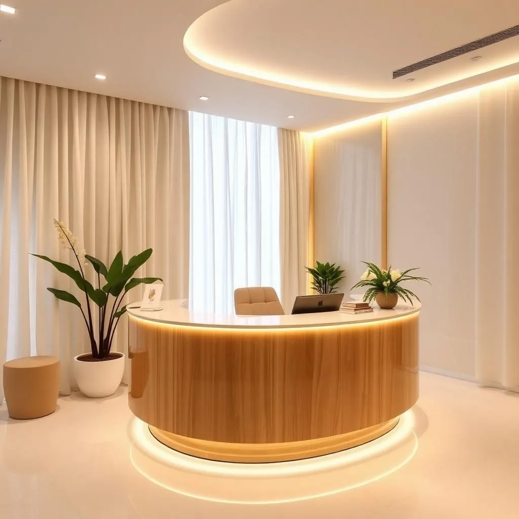 Bố trí một chậu cây nhỏ, lọ hoa hoặc đèn bàn nghệ thuật trên quầy lễ tân giúp tăng sinh khí và cảm giác thân thiện. Ánh sáng LED hắt nhẹ phía dưới chân quầy tạo hiệu ứng nổi khối đẹp mắt, đặc biệt vào buổi tối.