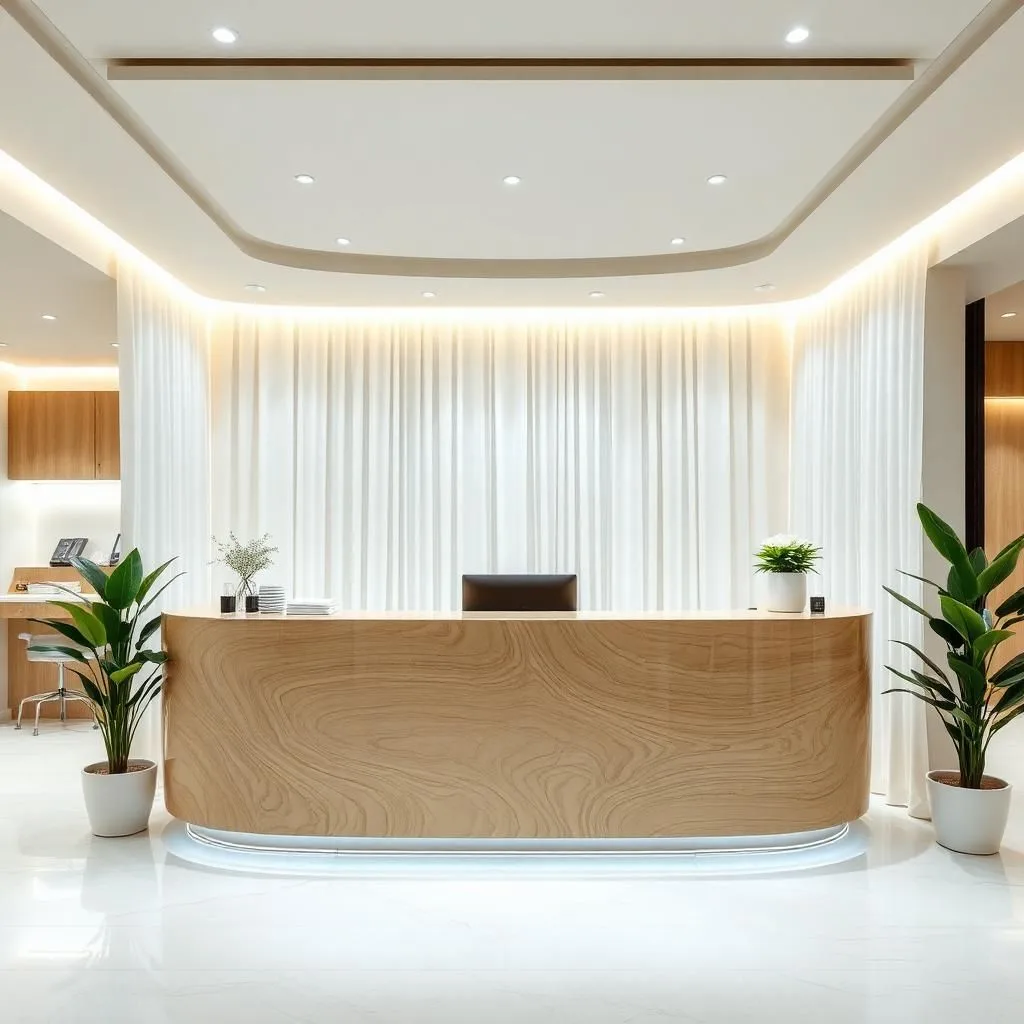 Sử dụng đường nét vuông vức, gọn gàng, gam màu trung tính (trắng, be, nâu gỗ sáng) kết hợp đèn LED ẩn, tạo nên vẻ thanh lịch và sang trọng – rất phù hợp cho spa hoặc văn phòng trẻ trung.